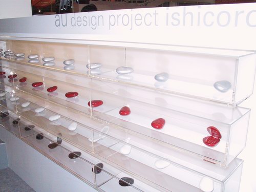 一方、KDDIのブースで目を引いたのが、石ころケータイ。石のカタチをしたこの携帯電話は、同社が国内外のデザイナーと進めているデザイン開発プロジェクト「au design project」の一環で参考展示されたものだ。