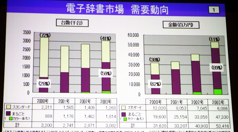 同社通信システム事業本部モバイルシステム事業部長の宇野裕史氏は、現在の電子辞書市場について「電子辞書は2つに大別される。1つはメーカーが辞書コンテンツを用意している普及型タイプで、もう1つは出版社がコンテンツを用意する本格的な辞書搭載タイプ。当社では後者を、紙の辞書をそのまま載せているということで“丸ごと辞書”と呼んでいるが、現在この丸ごと辞書の伸びが好調で、2002年は普及型の販売を台数・金額ベースで上回る」と語る。
