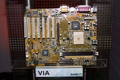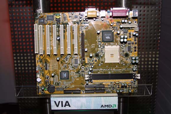 今回のデモではDDR266(PC2100)を使用していたが、実際に市場へ投入される製品版では、DDR333(PC2700)がサポートされるのは間違いないだろう。このようにプロセッサがメモリ制御回路を内蔵すれば、周辺チップメーカーの回路設計や製造が楽になっているのは容易に想像ができる。だからこそ今回のイベントで各社から早くもプロトタイプのチップセットが登場したともえいる。
