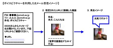 撮影した画像をEZweb上の専用サーバに登録し、あらかじめ登録しておいた音声と組み合わせて保存。相手に保存先URLをメールで送信し、相手がアクセスしてデータをダウンロードすると、画像と音声を同時に再生できる。
