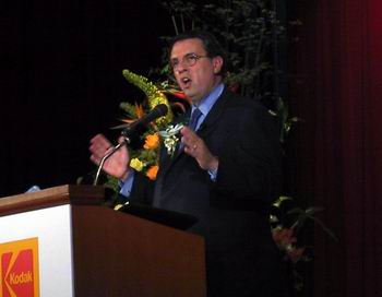 コダックは6月12日、米Eastman Kodak会長兼CEOのDaniel A. Carp氏来日にあたり、都内ホテルで近況報告会を開催。国内の取引先関係者やマスコミなど約1300人を集め、同社の事業活動について説明した。