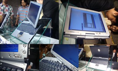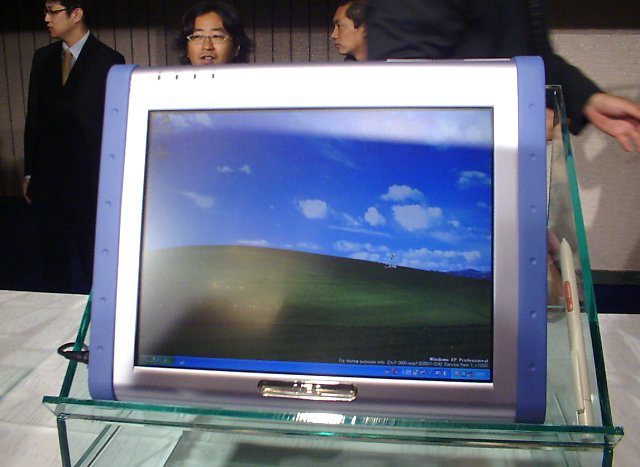 昨年の「COMDEX Fall 2001」でもBill Gates会長が紹介していたが、Tablet PCには、「コンバーチブル型」ならびに「ピュアタブレット型」の2種類がある。コンバーチブル型は、一見、普通のノートPCのように見えるが、液晶ディスプレイ部分を180度回転させて折り畳むと、タブレット型にもできるというもの。ピュアタブレット型は、キーボード部分がないタイプ。説明会では、ソーテックとNECがTablet PCのワーキングモデルを参考出品。ソーテックがコンバーチブル型、NECがピュアタブレット型だった。