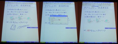 デモンストレーションは、大部分がTablet PC Editionの独自アプリケーションを使った手書き認識機能を紹介する内容だったが、製品正式リリース時には、「Microsoft Office」など既存のアプリケーションも手書き入力にネイティブ対応する予定だという。その一部として、手書き認識エクステンションを備えた「Microsoft PowerPoint」を使い、元データにペンでアンダーラインを引くといったデモも行われた。
