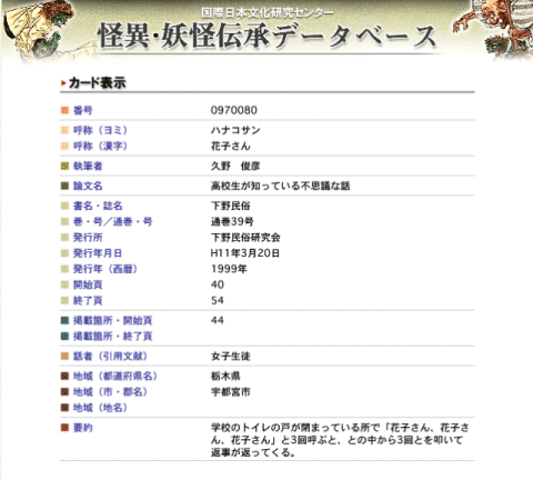 例えば、「トイレ 花子さん」で全文検索した場合、論文名は「高校生が知っている不思議な話」、話者は「女子高生」、地域は「栃木県宇都宮市」、ならびに「学校のトイレのドアを開けたまま『花子さん、花子さん、花子さん』と3回呼んで、ロール紙を切って便器に落とし、トイレに水を3回流すと、便器の中から手が出るという」といった要約文が出てくる。なお、データはすべてテキストベースであり、絵画資料は扱っていない(ディレクトリをたどっていくと、妖怪の画像が表示されるがこれは単なるイメージ図)。