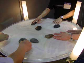 もっとも「産業用」バーチャルリアリティ展への出展物としては、いまひとつ「それでなに?」とか言われちゃうらしい。まぁこれはしかたない。なにより、これはあんなにぎやかな会場なんかじゃなくて、どっかのロビーみたいなところにさり気なく置かれるべきものなのだ。なんとなくホテルのロビーとかにあって、予備知識なしに石をいじったらポチャンって音がしたら、ちょっといいよね。