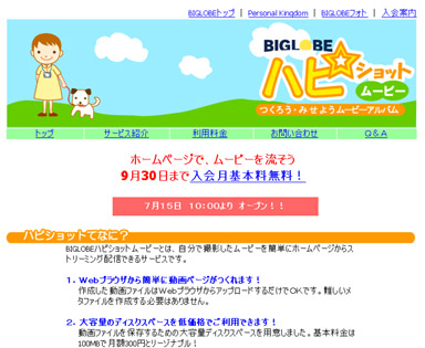 NECのIPS「BIGLOBE」は、動画のストリーミング配信ができる個人向けサービス「BIGLOBEハピショットムービー」を7月15日に開始する。
