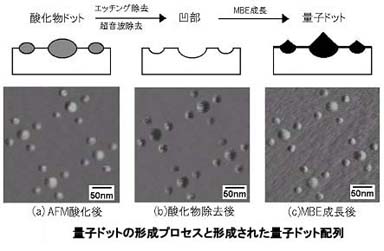 同研究所は今回、原子間力顕微鏡(AFM)を使った局所酸化とMBE選択成長技術を組み合わせた量子ドット作製方法を開発。AFMのカンチレバーに加えるパルス電圧と時間幅を変化させることで、量子ドットを設計通りのサイズとレイアウトで基板上に配列させることができた。
