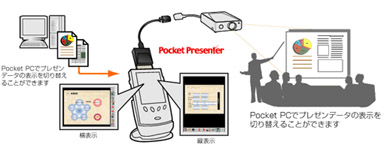 付属のPC用ソフト「NCT Pocket Presenter Desktop」でPowerPointファイルをJPEG画像に変換し、Pocket PCに転送・保存。Pocket PCから付属のコンパクトフラッシュスロット対応出力アダプタを使い、プロジェクタ(D-Sub15ピン)とTV(コンポジットAV)に出力する。