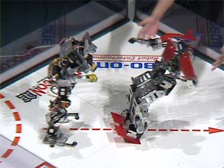 この試合、R-BlueIVはよく倒れた。なぜなら、自分より大きなAdamant 2ndを倒すためには、自分も倒れることを前提にして大きな攻撃をしかけるしかないからだ(Adamant 2ndは倒れたら起き上がることができない)。しかしAdamant 2ndは倒れない。R-BlueIVがひとりで倒れては起き上がっている。なんと、5ラウンドで8回も倒れているのだ。この状況だと、Adamant 2ndは攻め手がなくなる。倒れている相手に対する攻撃は許されていないから、踏んづけて起き上がれないようにっていうこともできない。
