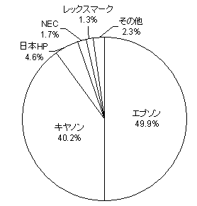 出荷台数は326万台(前年同期比8.2%減)、金額は1763億円(同11.2%減)となり、初めてマイナスに転じた2001年下半期に続いて市場縮小となった。全体のベンダー別シェア(台数ベース)は、セイコーエプソンが44.4%でトップ。2位がキヤノン(37.5%)、3位が日本ヒューレット・パッカード(3.7%)となっている。