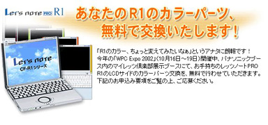 松下ネットワークマーケティングは、10月に開かれる「WPC Expo 2002」(16−19日、東京ビッグサイト)会場で、小型モバイルノート「Let'snote CF-R1」のカラーパーツを無償交換してくれるキャンペーンを行う。