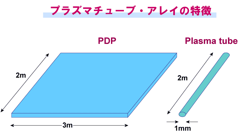 この方法だと、画面サイズはプラズマチューブの並べる本数によっていくらでも広げることが可能となる。チューブの長さは2−3メートルを目標としているとのことなので、16対9の横長ワイド画面を作るなら、縦にチューブを並べることで150−250インチという超大画面も可能になるのだ。