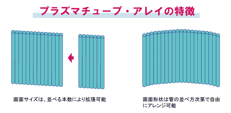 この独自チューブ構造は、大画面以外にもメリットがある。「例えば、チューブを弧を描くように並べれば、湾曲した大型ディスプレイも簡単に作れるなど、画面形状もチューブの並べ方次第で自由にアレンジ可能。また、従来のPDPよりもセルサイズが大きいことから、高い発光効率が期待できるほか、発光方式は従来と変わらないため駆動回路なども流用できる」(栗本氏)。