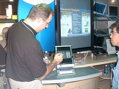 このうち、「Windows XP Tablet PC Editon」と「Pocket PC」のブースは背中合わせになっていたが、面白かったのは、双方のブースに集まる人種がきっちりと異なっていたことだ。Tablet PC側はほとんどがアジア系で、裏側のPocket PCは白人ばかり。Pocket PCでは、中でもSmart Phoneが関心を集めていたが、日本人の感覚から言うとひたすら「デカい」としか言いようがなかった。