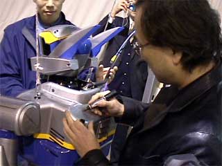 発表会の後、川田工業のチームが出渕さんにお願いして、Prometの1号機(2体あるのだ)にサインを入れてもらっていた。これが、そのシーン。いいな。