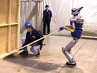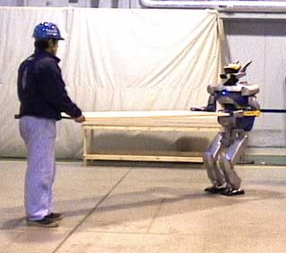 パネルを傾けた分だけ、Prometに近づいてもらって、位置合わせ。ここのインタフェースはよくない。さっきの応用で、Prometが近づくときに、人間がパネルを傾けてようとすると、それを感知してPrometも手を少しゆるめる。Prometはそのまま位置合わせのためにゆっくり近づいて、「ストップ」で、位置合わせ終了っていうのが美しい。人間相手のときにはそういう風に作業するものね。現在の音声認識速度だと、タイミングがとれないのかもしれないんだけど。