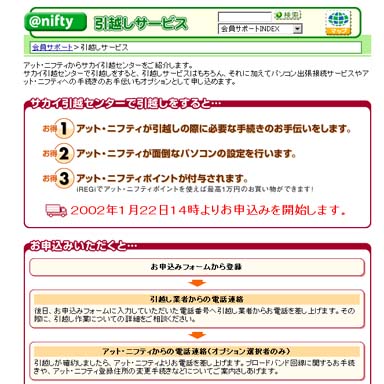 ニフティは、「@nifty」会員が引っ越し荷物輸送サービスとADSL関連の手続き、PCの設定サービスを同時に申し込める「@nifty引越サービス」を1月22日から始める。