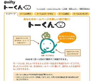 @niftyは1月22日、おしゃべりキャラ作成CGI「トーくん」サービスの提供を開始した。月額200円/1キャラクター(2003年3月末までは無料)。