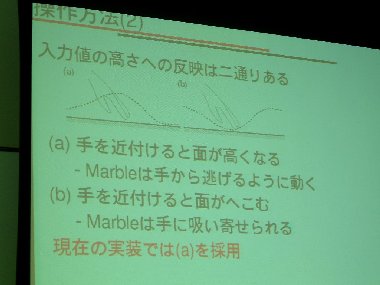 テーブルは平面ではなく、手の位置を中心に仮想的な曲面をなしていて、手を近づけるとそこが仮想的に盛り上がるので、マーブルは転がっていくように手から離れていく。