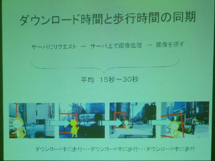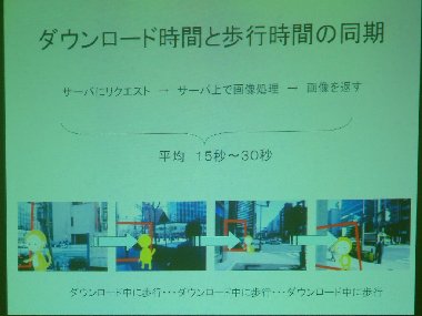 そこで、歩きながら使えるようなナビゲーションを作るシステムが紹介された。このヒューマンナビでは、キャラクターを重視して、まるでキャラクターが先導するかのように画面上で行き先を案内してくれるようになっている。ヒューマンナビはすでに実用化されいてるものも少なくないが、地図ベースのものよりも、今回のような写真ベースのもののほうが、今後増えていくのかもしれない。