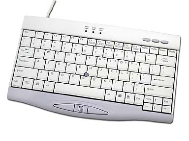 テンキーを省き、292(幅)×172.6(奥行き)×34(高さ)ミリとコンパクトなキーボード。中央部にスティックポインタを搭載するほか、新たに画面スクロールが可能なホイールを手前側に設けた。