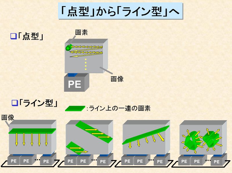 多様な状況に対応するためには、ソフトウェア処理が必須となる。これに適しているのは汎用プロセッサの利用だが、従来は単一の高性能プロセッサで画素を順番に処理していく「点型」だったため、高速処理に限界があった。