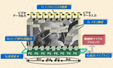 また新チップでは、128個もの多数のプロセッサを有効利用するために、(1)各PEのメモリに自動的に列単位のビデオ画像を格納する「シフトレジスタ機構」、(2)各PEが独立にデータを参照可能な「メモリ構成」、(3)PE間のデータ授受を効率化する「リング状PE間結合」、(4)データ授受を効率化する「融合パイプライン」、(5)PEの処理切り替えを効率化する「専用命令」、などの新技術が盛り込まれている。