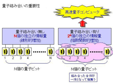 だが、量子重なり合いが成立しただけでは、仮に量子ビットの数が増えてN個になったとしても、扱えるのはN個の独立した情報量にしか過ぎない。ここで「量子絡み合い」状態を実現できると、扱える情報量は2のN乗個となる。量子ビットの増加によって、扱える情報量は指数関数的に増加することになるわけだ。