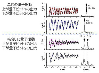 今回実験で使用された量子コンピュータは下の模式図のように2つの量子ビットによって構成されているが、量子絡み合い状態になることで、それぞれの量子ビットがお互いに影響しあって動作することになる。これによって、コンピュータの基本回路とも言える2ビット論理ゲート(C-NOT動作)が実現するわけだ。この論理ゲートが出来上がれば、あとは多数の論理ゲートを組み合わせることでコンピュータとして基本的な処理ができるようになる。