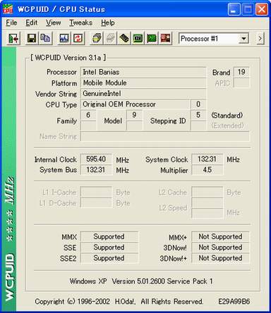 一方、U101で最も気になるのが「モバイルCeleron/600A MHz」なるCPU。インテルのロードマップにもリリースにも出てこない(はず)のCPU。ソニーが頑なに「違うんですよ」といっても、WCPUIDではProcessorに「Banias」と表示されてしまうし、搭載チップセットはIntel 855PM。