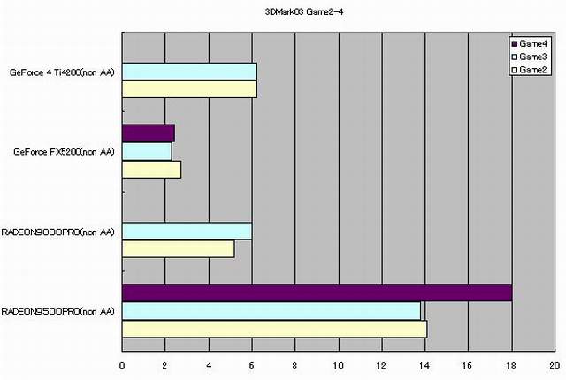 各ベンチマークの総合結果である「3DMark」「3DMark03 Score」と、Game1からGame4までの個別の結果をそれぞれ別グラフにした。
