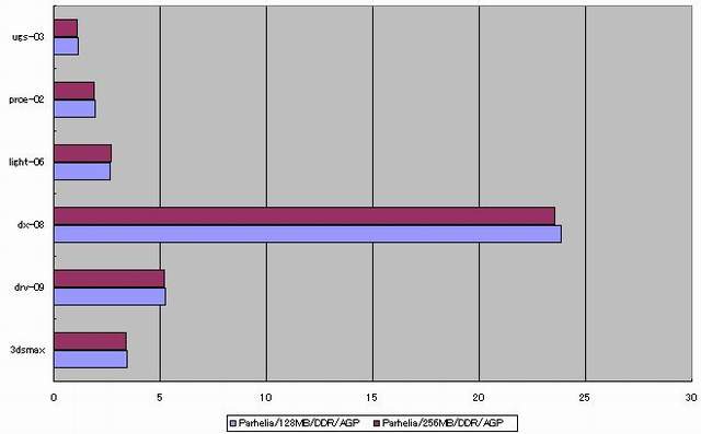 このようなParhelia-512搭載ビデオカードにとって、搭載メモリの増加はパフォーマンスにどれだけ影響するだろうか。Open GLの標準ベンチマーク「SPECviewperf」で、確かめてみた。