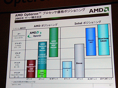 今回の発表会でAMDが最も強くアピールしていたのが、「ユーザー主導によるシームレスな移行」と「低コストでの導入」。「Intelの64ビットコンピューティングは、現在の資産を継承することなく、彼らが主導し、彼らが(導入時期を)選択する」と、メーカーがイニシアティブをとるIntelと比較して、「膨大な32ビットコンピューティング資産をそのまま継承しながら、ユーザーが選択した時期に64ビットコンピューティングに移行できる」とユーザーがイニシアティブをとるAMD 64によって、64ビットコンピューティングが急速に普及すると述べた。