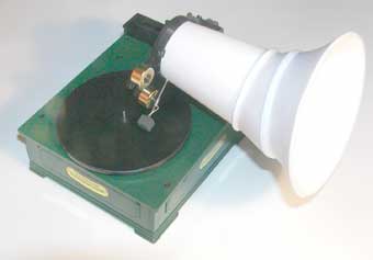 できあがった蓄音機。組み立てに要した時間は、写真を撮りながらでちょうど1時間だった。