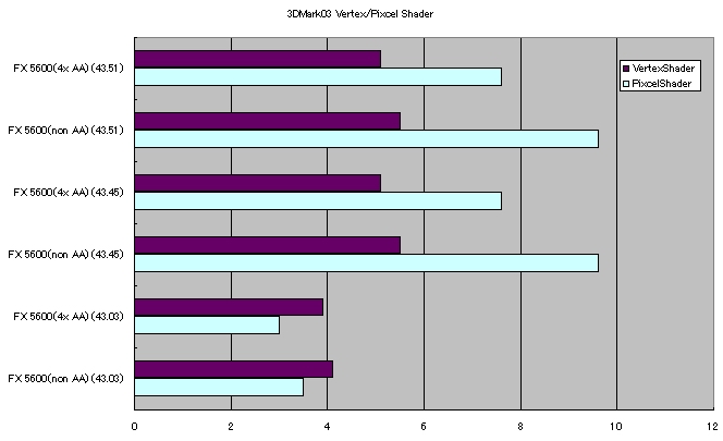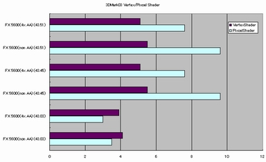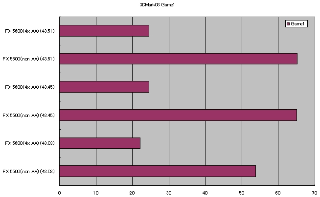Detonatorのバージョンで結果が変わるのは、総合結果の3DMark03 ScoreとGame1−4、そして個別テストではVertex Shader、Pixcel Shader 2.0。43.45と43.51を比較すると、3DMark03 Scoreの値が1441(non AA時)から1370(non AA時)と下がっているが、個別に結果を見ると下がっているのはGame3だけ(8.3から6.7)。Game3で使われる機能はGame2とそれほど変わらないので、なぜGame3だけ描画速度が遅くなるのか現時点では不明だが、これ以外の結果で変化がないところを見ると、WHQLを取得した43.51でもパフォーマンスは43.45並みと考えていいだろう。