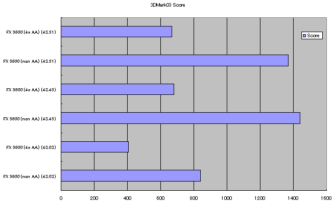 3DMark03で行ったベンチマークの結果は先日の記事「ようやく登場「RADEON 9600 PRO」「GeForce FX 5600」パフォーマンスを比較する」でも掲載したが、見やすいようにFX5600だけを抜き出した結果をもう一度掲載しておこう。