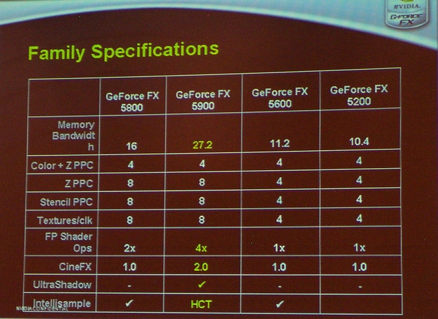 FX5800の後継ではあるが、ハイエンドのFX5900 Ultraの動作クロックはコアクロック450MHz、メモリ駆動クロック425MHzとFX5800よりも低く設定されている(なお、NVIDIAによると、FX5900とFX5900 Valueの動作クロックは現在確定していない)。クロックが下がっている代わりに、FX5900ではサポートする機能や内部アーキテクチャを変更することで、パフォーマンスのアップを図っている。