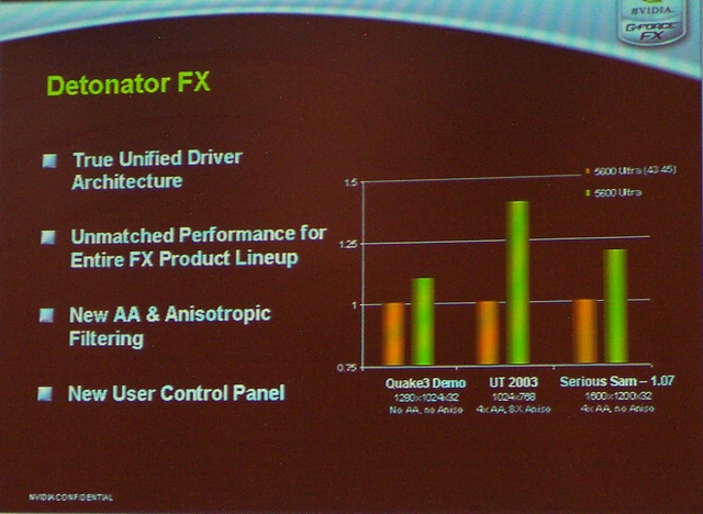 NVIDIAの統合ビデオドライバ「Detonator」はFX5900の発表に合わせて「Detonator FX」が新たに登場。NVIDIAのWebサイトから5月14日からダウンロードできるようになる予定だ。NVIDIAはDetonator FXを使うとFXシリーズのパフォーマンスがDetonetor 43.45より最大40%程度向上するとしている。