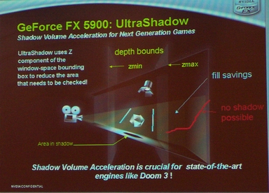 また、FX5900シリーズでは「UltraShadow」と「Intellisample HCT」の2つの機能が追加された。UltraShadowは、陰影に関わる処理負荷を軽減させ、描画演算速度を改善させる工夫。処理する奥行きを設定し、さらに視点から隠れて見えない部分の「演算不要領域」を求めることで、演算回数を削減する。