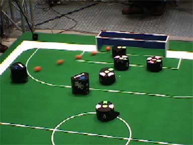 卓球台くらいの大きさのフィールドで、最大5台のロボットで1チームを作るリーグだ。天井にカメラが置き、各プレーヤーロボットは、そのカメラでとられた全体画像を使ってプレイをすることができる。だから、このリーグでは「戦術」が進歩している。あるプレーヤーがディフェンスを引きつけておいて、反対側にオープンスペースを作るなんてことができないと、世界レベルでは戦えない。