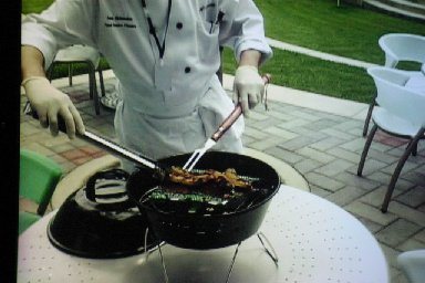 しかし、実際にはNVIDIA自身、ユーザーからの声を受け、空冷ノイズを大きな問題として捉えていたようだ。GeForce FX5900の紹介前にビデオが流され、NVIDIA幹部が会議室に集まってGeForce FX5800の用途についてジョークビデオを流した。ビデオの中ではFX5800をドライヤー代わりに使う女性や、FX5800の熱を利用してコーヒーをいれたり、あるいはバーベキューを焼く、なんていうシーンも登場した。