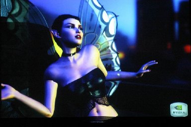 さて発表会唯一の見せ場であるデモプログラムを使ったプレゼンテーションでは、3つの新しいデモが使われていた。ひとつはNVIDIA GeForce FXシリーズのイメージキャラDawnの妹(と会場ではアナウンスされていた)Duskが踊るデモ。彼女が着る革製のトップの質感、バンプマップによる凹凸に対応した微妙は影などが見所。「妹のDuskには陰がある」と微妙な言い回しで紹介。