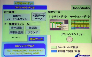 「ロボット市場は2006年以降大きな伸びが期待されるが、その原動力となるのはパートナー型ロボット。しかし、人とコミュニケーションができるロボットを開発しようとすると、基本ソフトウェアからすべて作らなくてはならない。仮にこれらを1からやると、長期の開発期間を要し、開発費は数億円に及ぶ。このような、開発に必要な基本ソフトウェアなどを汎用のプラットフォームとして提供するのがRoboStudio。ロボットベンダーは、どんなロボットにするかといったアプリケーション部分の開発に専念できる」(同社)。