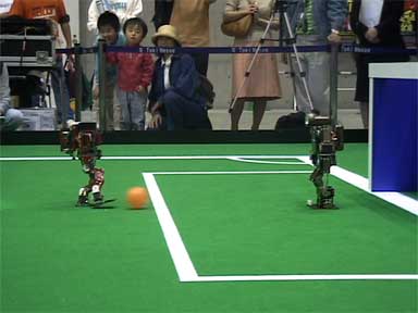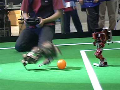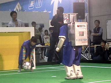 Robocupにおいてヒューマノイドvsヒトの対決ははじめてである。もしかすると、こういう公式の舞台においてはじめてなのかもしれない(ASIMOのデモなんかではあったかもしれないけど)。