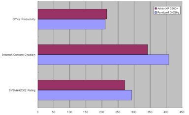 SYSmark2002では、Internet Content Creationのスコアが400を超え、AthlonXP 3200+を大きく引き離している。これは、テストにPhotoshopやMicrosoft Movie Maker、Media EncoderといったハイパースレッディングやSSE2に対応したアプリケーションを含んでいるため。一方、Office Productivityでは、AthlonXP 3200+を少し下回ったスコアになっている。
