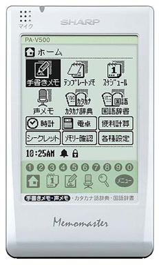 日常的に必要なメモ記録に着目したPDA。本体上面のボタンをワンプッシュすれば録音が始まる「声メモ」機能、液晶画面からスタイラスで手書き入力ができる「手書きメモ」機能を利用できる。また「時刻表」「備忘録」「出費メモ」の3つのフォームに従って入力するだけで簡単にメモが取れる「テンプレートメモ」機能も備えた。