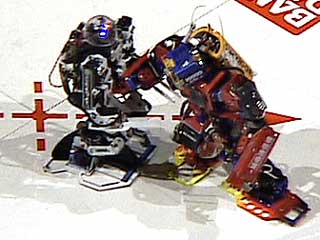現在のROBO-ONEのルールは、「ゴングに救われる」ということがない。ダウンしている途中でブザーが鳴っても、起き上がるまではカウントが続けられる。ところが、倒れている2325-RRを、チームの人がブザーが鳴ったからって取り上げてしまった。これでは、ギブアップになってしまう。2325-RRはまたもラウンドを失ってしまった。