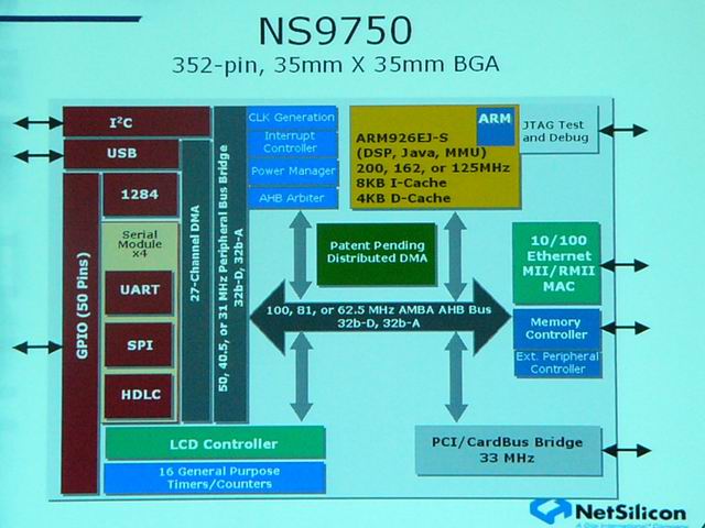 これまで同社は、ARM7をコアに搭載した「NET+50」をミドルレンジの主力製品として、よりコストを抑え10ドルを切るローエンド製品として「NS7520」を供給してきたが、今回発表されたNS9750は、これまで抜けていたハイエンドラインアップとして位置付けられており、より高性能多機能を発揮するために最高200MHzで動作するARM9コアを搭載している。