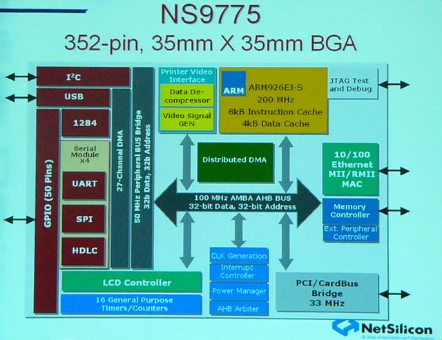 NS9750は、コアの駆動クロックによって3種類の製品が用意されている。最上位は動作クロック200MHzで1万個出荷時の単価は19.95ドル。次は162MHzで同じく18.45ドル。最も廉価なのは125MHzで同じく14.95ドル。OEMに対するサンプル出荷は10月から開始され、チップを搭載した製品は来年1月に登場する予定だ。