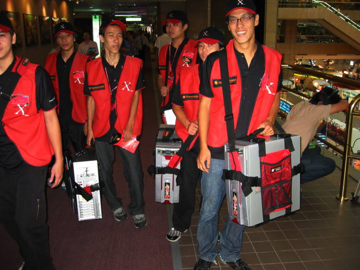 日本でも少し有名になりつつあるPCケースや電源などの周辺パーツメーカーThermaltakeでは、PC持ち運び用の帯「XaserBag」や、外付けタイプの水冷システム「AquariusIII」など個々のパーツも楽しいが、どの製品ということではなく、会社のイメージを全面に押し出し、統一されたファッションを醸し出すのに成功している。